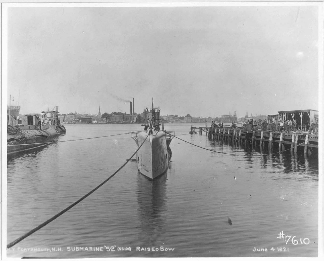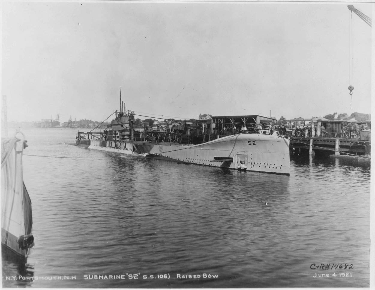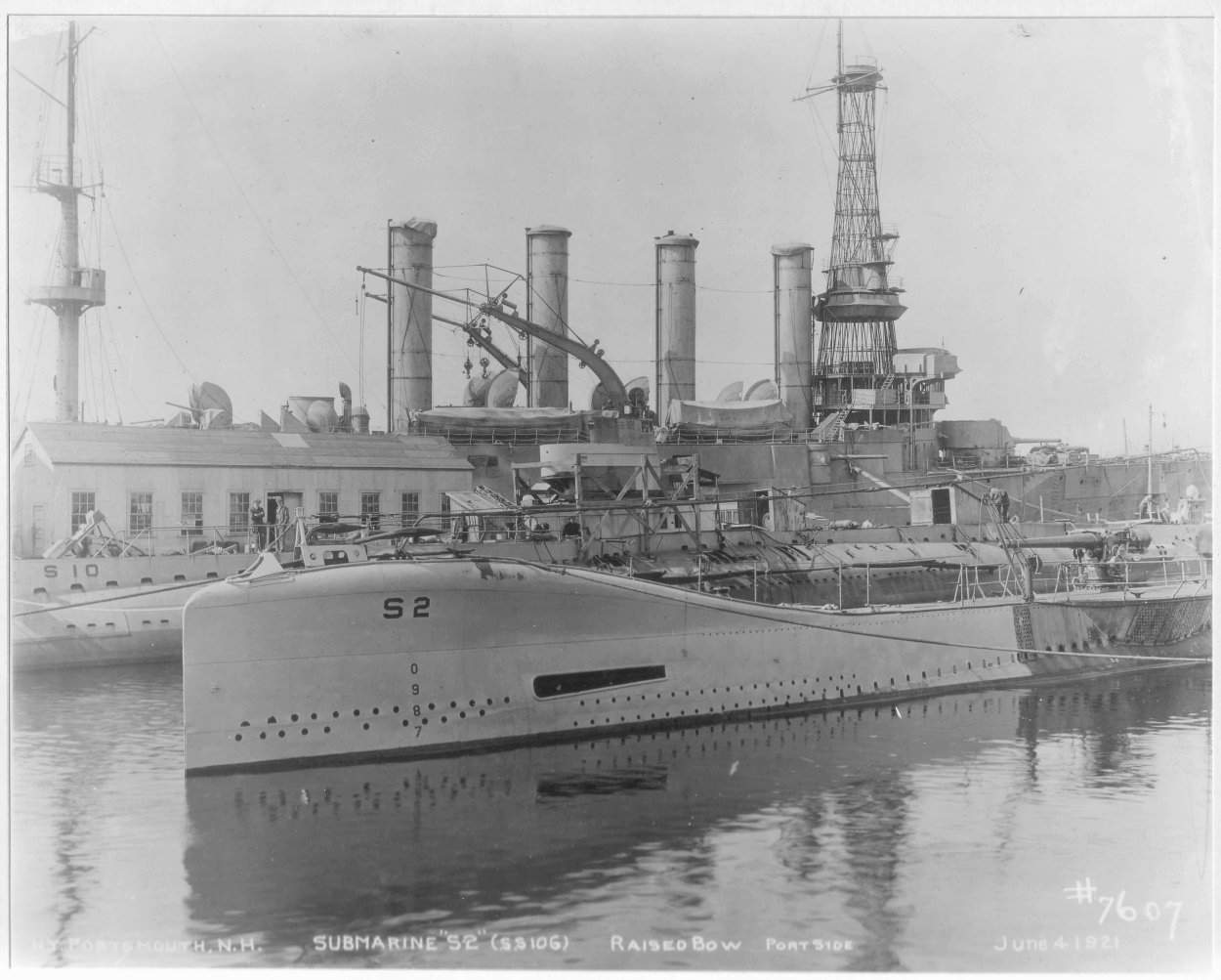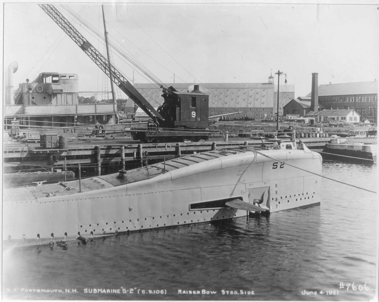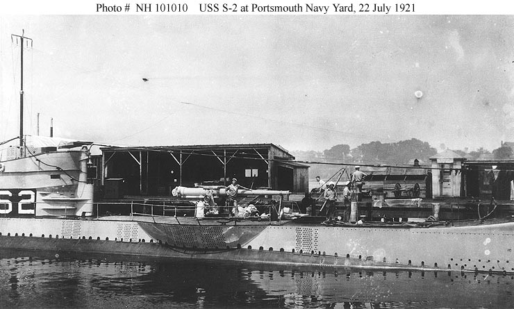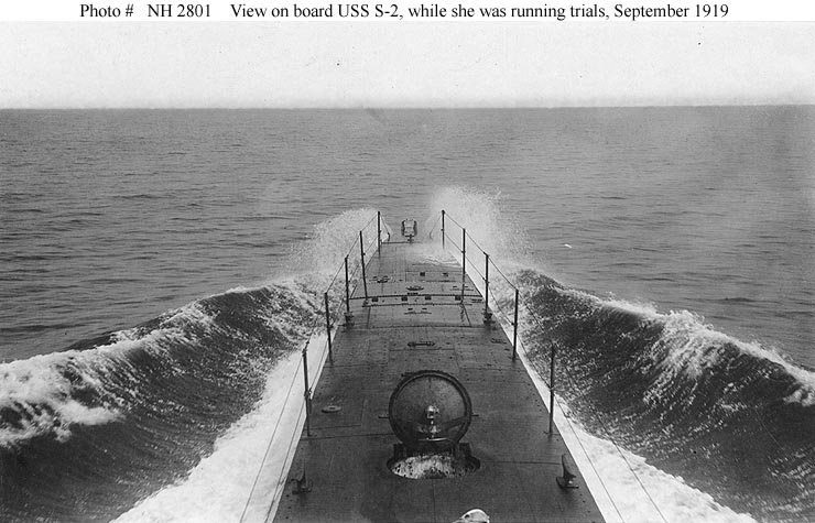 279k | Raised bow view, port side of the S-2 (SS-106) coming up at her dock trials at the Navy Yard, Portsmouth New Hampshire, 4 June 1921. | USN photo # 19-N-7609, from the National Archives and Records Administration (NARA), courtesy of Daniel Dunham. | |