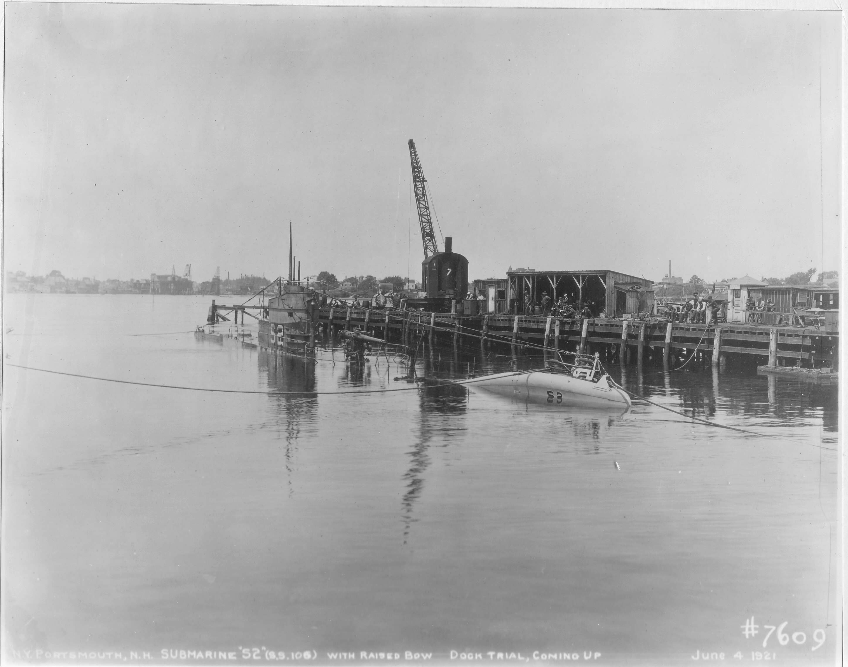 374k | Raised bow view, port side of the S-2 (SS-106) at her dock trials at the Navy Yard, Portsmouth New Hampshire, 4 June 1921. The S-10 (SS-115) is pictured inboard. Further inboard is the armored cruiser Huntington (CA-5). She had been decommissioned on 1 September 1920. |