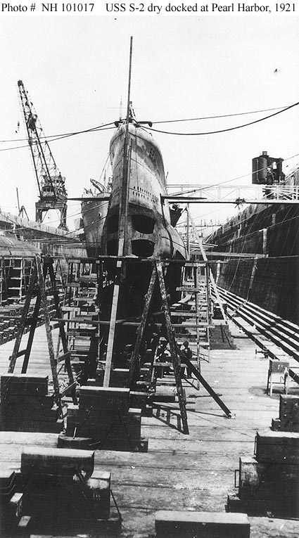 87k | In drydock at the Pearl Harbor Navy Yard, Hawaii, in October 1921. Note torpedo tube openings in S-2's (SS-106) underwater hull, and recently enlarged above-water bow superstructure. | Copied from the collection of David J. Lohr, by courtesy of Radioman 1st Class Pamela J. Boyer, USN, 1986. USNHC photograph # NH 100117. | |