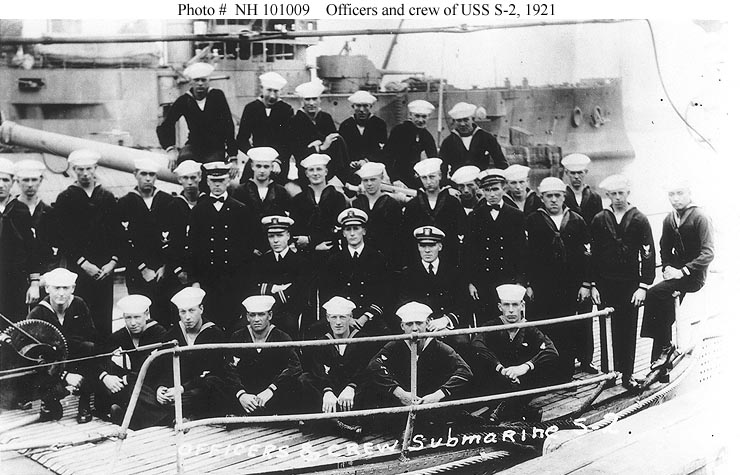 93k | S-2 (SS-106) officers and crew, 1921. Chief Gunner's Mate (Torpedoman) David J. Lohr standing just to the left of the three officers. Note the armored cruiser in the background. | Copied from the collection of David J. Lohr, by courtesy of Radioman 1st Class Pamela J. Boyer, USN, 1986. USNHC photograph # NH 101009. | |