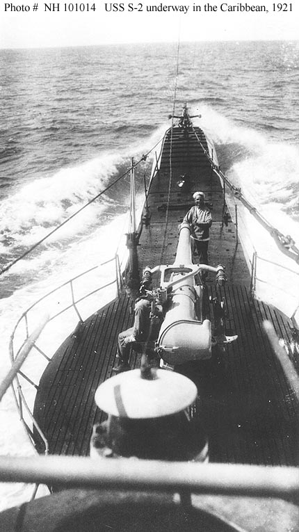 72k | View looking forward from S-2's (SS-106) bridge, while she was underway in the Caribbean Sea, August 1921. S-2 had recently been fitted with an enlarged bow structure, as seen here, to improve her sea keeping. Note the sealed breech mechanism of her "wet" type 4"/50 deck gun. | Copied from the collection of David J. Lohr, by courtesy of Radioman 1st Class Pamela J. Boyer, USN, 1986. USNHC photograph # NH 101014. | |