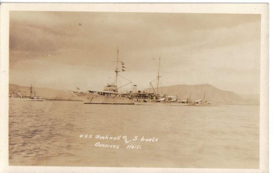 61k | Bushnell (AS-2) at Gonaives, Haiti, circa 1924 tending her charges: S-11 (SS-116), S-12 (SS-117), S-10 (SS-115) & and S-13 (SS-118). | USN photo courtesy of Robert M. Cieri. | |