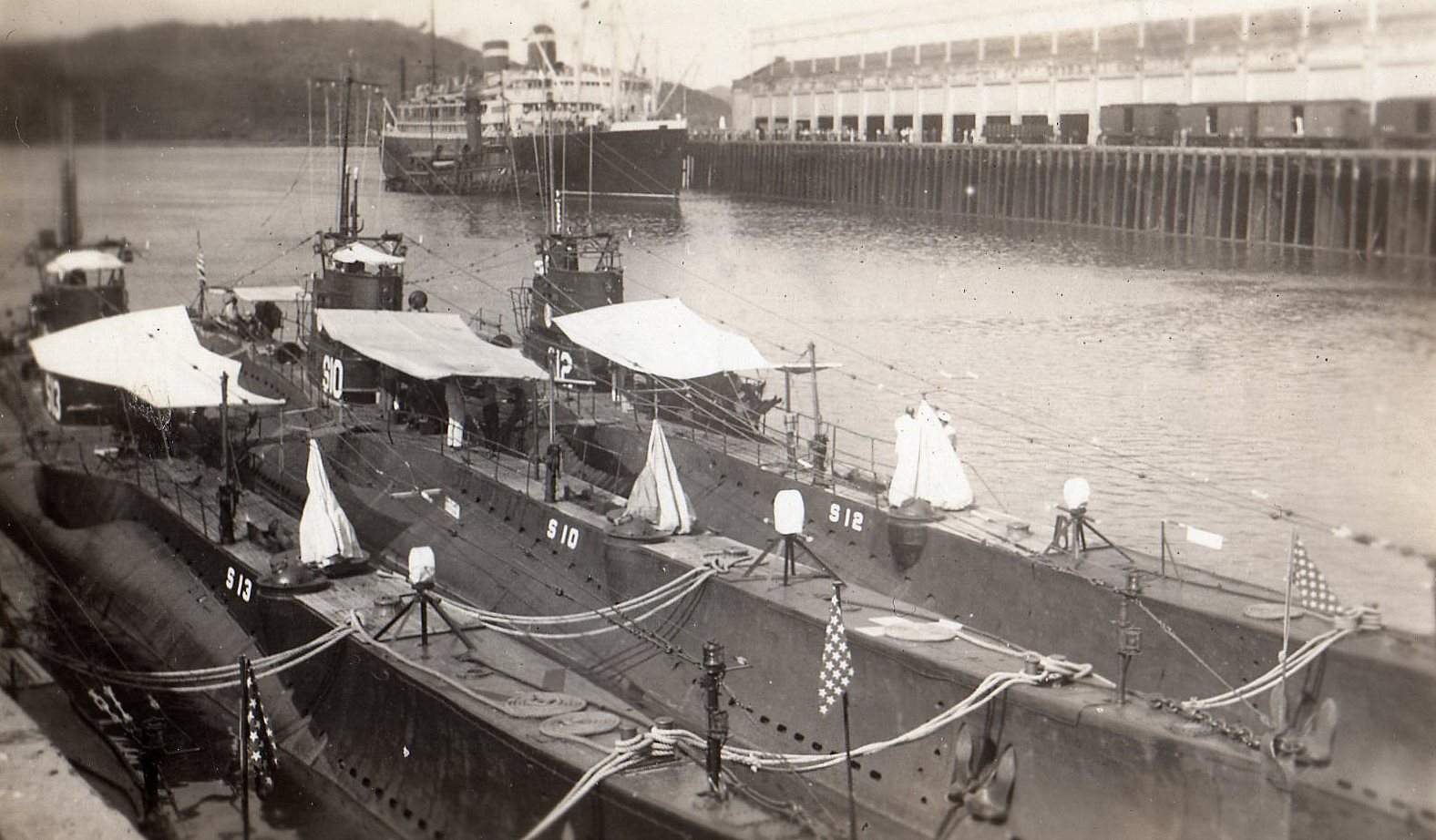 The location is Coco Solo, Panama. One other clue as to the date of the photo is the fact that all the boats are still painted haze gray. There was a date in the mid 30's when the Navy shifted over to basic black for all the boats. I am thinking that this photo was taken just before that date. The boats on the left have all been modified with the safety updates, i.e marker buoys and hatches capable of taking a McCann Rescue Chamber, but they are still all gray. |