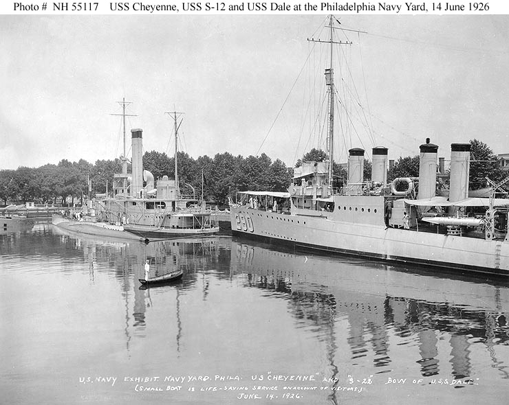 120k | Cheyenne (IX-4), inboard at left; S-12 (SS-117), outboard at left; and Dale (DD-290) at the Philadelphia Navy Yard, Pennsylvania, 14 June 1926, during the National Sesquicentennial exhibit there. The small boat and Sailor, in the foreground, are on life-saving service to protect exhibit visitors. | USNHC photograph NH 55117. Collection of Vice Admiral Dixwell Ketcham, USN. | |