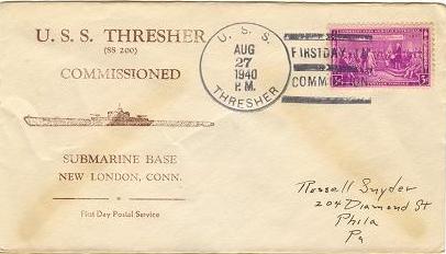 25k | Commemorative post mark honoring the commissioning of the Thresher (SS-200), 27 August 1940. | Courtesy of Jack Treutle (of blessed memory). | |