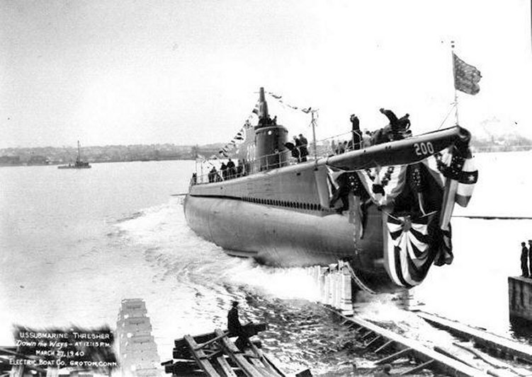 74k | Thresher (SS-200) slides down the ways at the Electric Boat Co., Groton, CT., 27 March 1940. | USN photo courtesy of Bruce A. Broseker @ broseker.net. | |