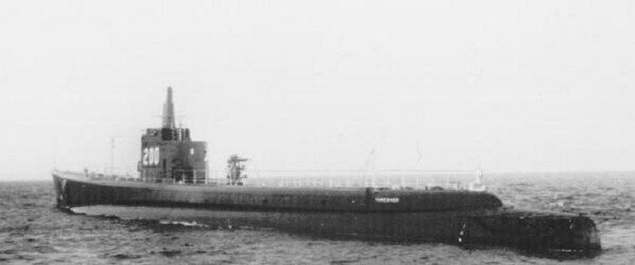 127k | Broadside view of the Thresher (SS-200) off Mare Island on 6 October 1943. She was in overhaul at the shipyard from 8 August until 8 October 1943. | USN photo # 6969-43 courtesy of Scott Koen & ussnewyork.com. | |