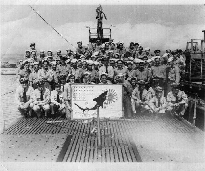 70k | Thresher's (SS-200) crew poses on deck with the ship's score card, circa 1945. | USN photo courtesy of Bruce A. Broseker @ broseker.net. | |