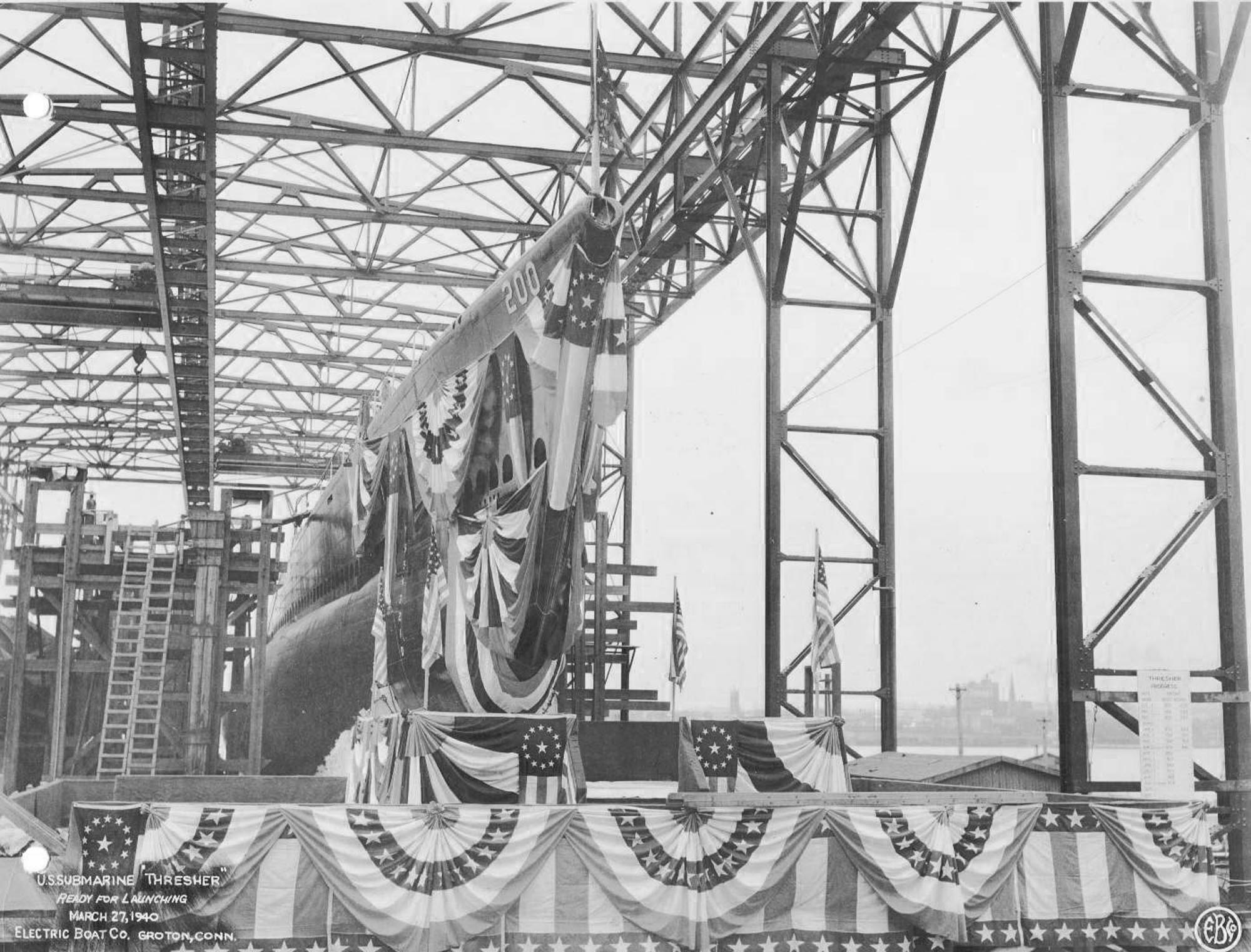 ![]() | 181k | Stern view of the Thresher (SS-200) prior to launching at the Electric Boat Co., Groton, CT., 27 March 1940. | USN photo courtesy of Scott Koen & ussnewyork.com via Bruce A. Broseker. | |