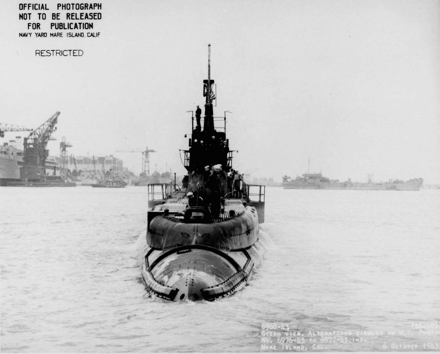 117k | Stern view of the Thresher (SS-200) in the Mare Island channel on 6 October 1943. LST-31 is in the background to the left of Thresher. | USN photo # 6968-43, courtesy of Darryl L. Baker. | |