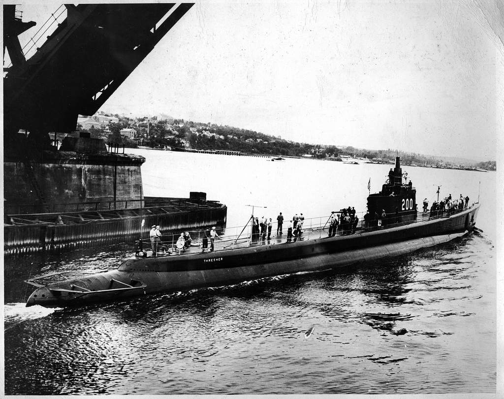 346k | The Thresher (SS-200) with the State Pier in New London in the background. This photo preceeds the below photo of her as she was passing through the train bridge. | Photo & text courtesy of John Kelly. | |