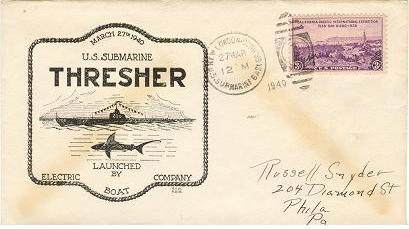 21k | Commemorative post mark honoring the launching of the Thresher (SS-200), 27 March 1940. | Courtesy of Jack Treutle (of blessed memory). | |