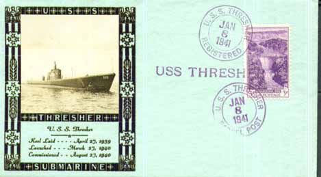 23k | Commemorative post mark & photo honoring Thresher (SS-200), 8 January 1941. | Courtesy of Jack Treutle (of blessed memory). | |