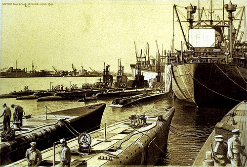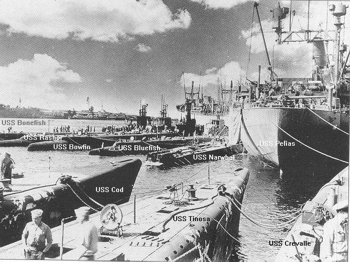 From left to right, stern view to the camera are the Bonefish (SS-223), Rasher (SS-269), Bowfin (SS-287), Bluefish (SS-222), Narwhal (SS-167) and the sub tender Pelias (AS-14). Second row, bow view are the Cod (SS-224), Tinosa (SS-283) and Crevalle (SS-291). I believe the only time that photo could have been taken was 19 December 1943. The Tinosa was in Fremantle only once, from 16 December 1943 to 10 January 1944. During that brief window, the Bonefish had not arrived until 19 December and the Rasher departed 19 December so that is the single date all three submarines were ever in Fremantle port at the same time. | Photo i.d. courtesy of Dan Goodell. USN photo courtesy of Ric Hedman. |