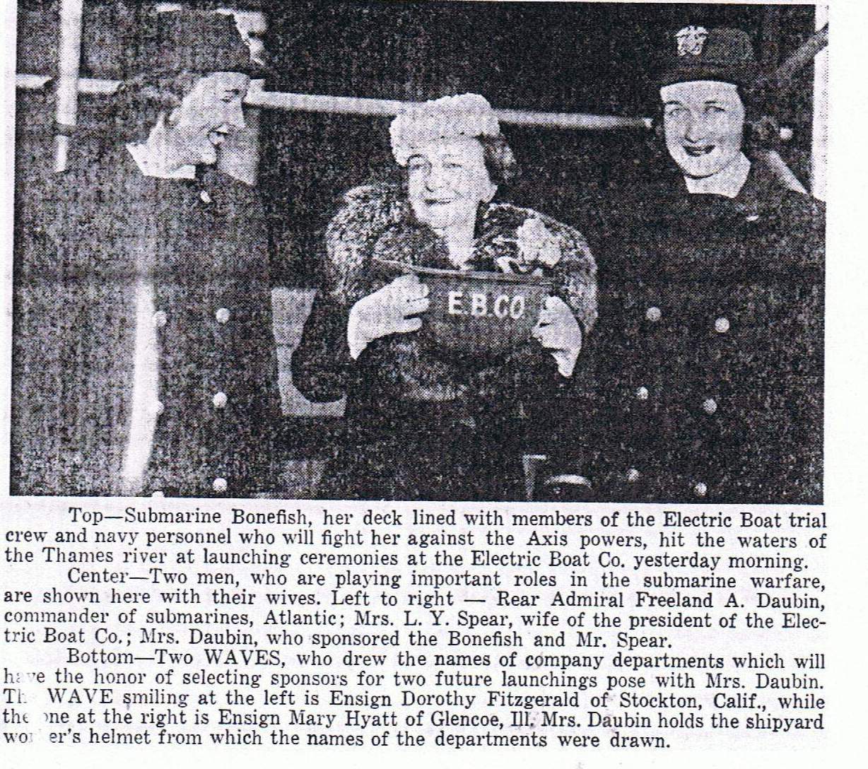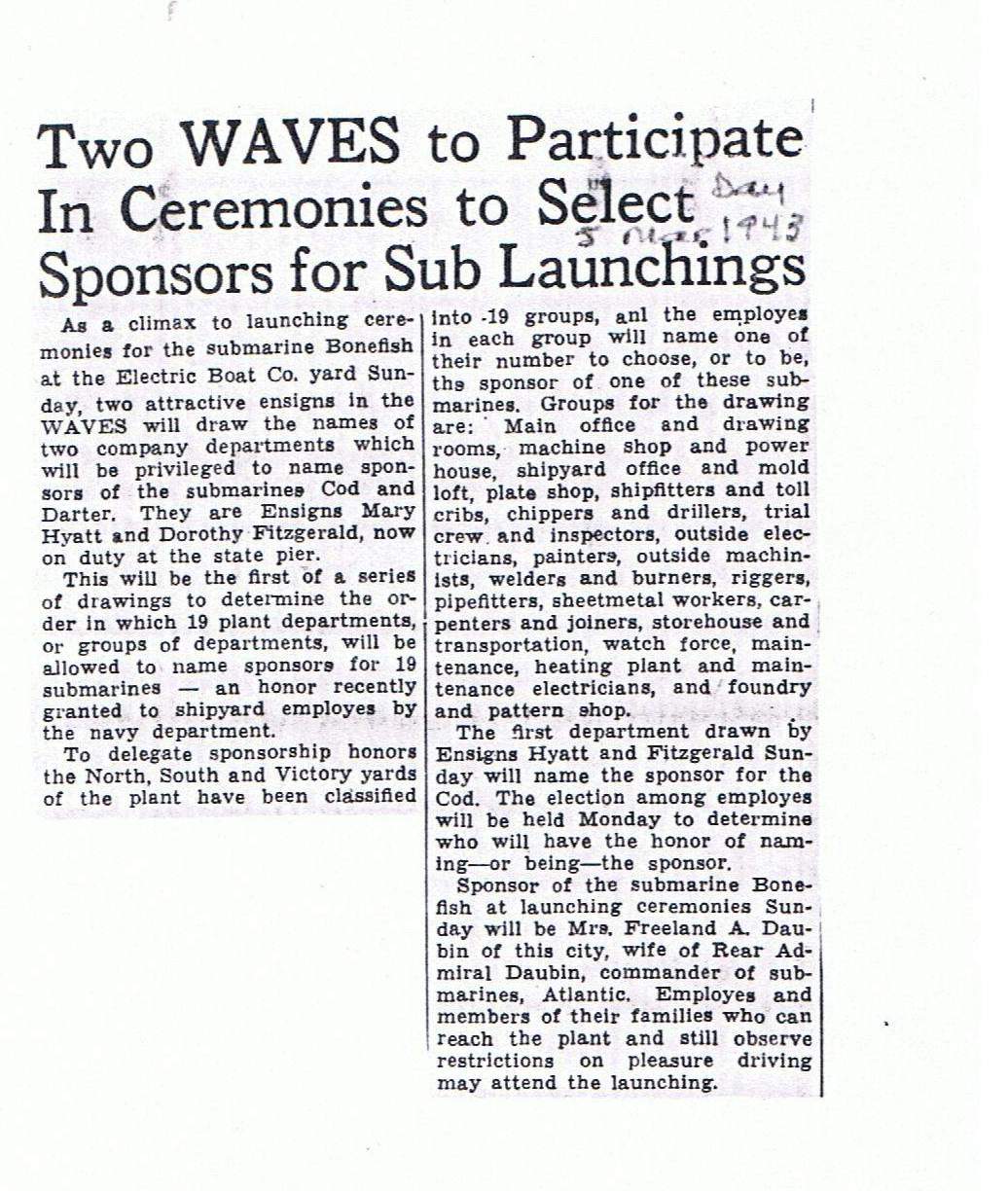 198k | Two WAVES to Participate in Ceremonies to Select Sponsors for Sub Launchings. | Photo courtesy of New London Day, 5 March 1943, through the kindness of Wendy S. Gulley, Archivist, Submarine Force Museum, Naval Submarine Base NLON, Groton, CT. | |