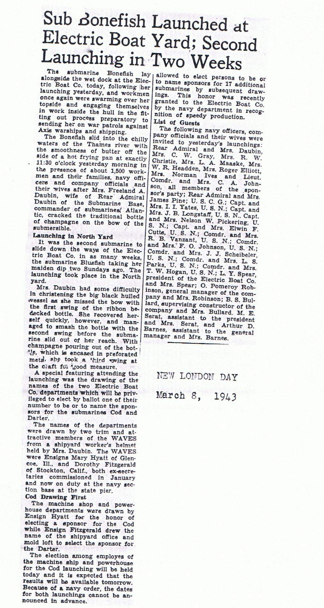 376k | Sub Bonefish (SS-223) Launched at Electric Boat Yard; Second Launching in Two Weeks. | Photo courtesy of New London Day, 8 March 1943, through the kindness of Wendy S. Gulley, Archivist, Submarine Force Museum, Naval Submarine Base NLON, Groton, CT. | |