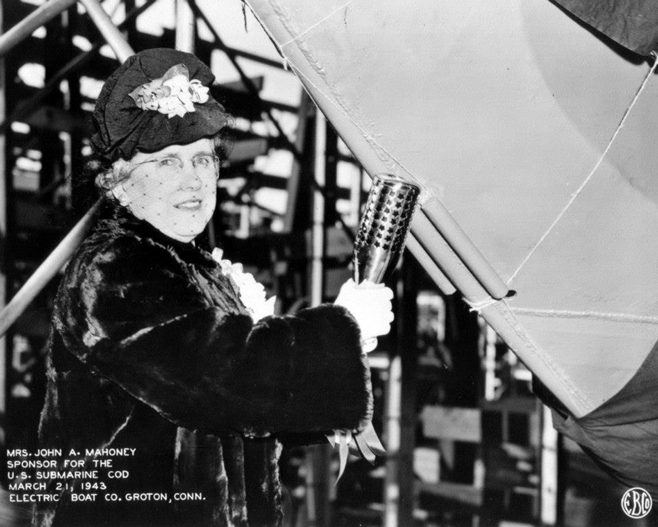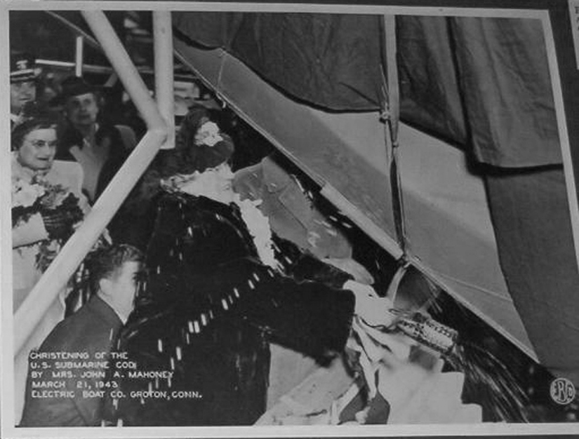 ![]() 0822429 | 555k | The Cod (SS-224) was sponsored by Mrs. Grace M. Mahoney; wife of a veteran employee of E.B. She is seen here holding the unbubbled bubbly on 21 March 1943. |