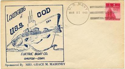 ![]() | 22k | Commemorative post mark from Cod's (SS-224) launching, 21 March 1943. | Photo courtesy of Jack Treutle (of blessed memory). | |