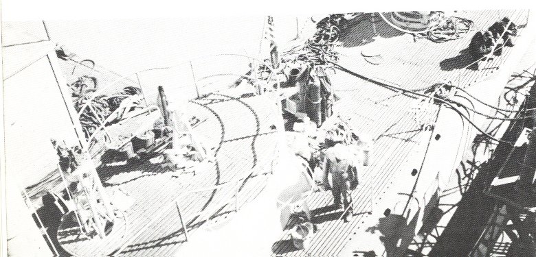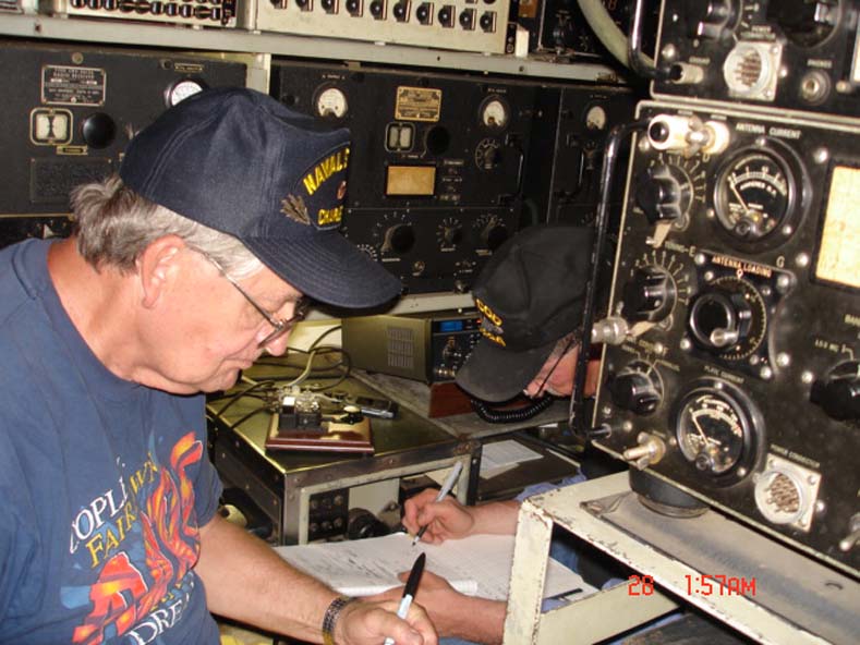 ![]() | 105k | Radio Shack is just a little bit bigger than a "Pay Toilet". The Radio Shack is built for midgets, we used the original Long Wire on the Starboard Side, on Main Deck, about a 110 ft long, at about 9 ft above the deck. Picture includes Bill KA8VIT and I, N1EZZ working CW in the Shack on 40 meters !! Black radio in front is a TCS. | Courtesy of John Hummel, USN (Retired). | |