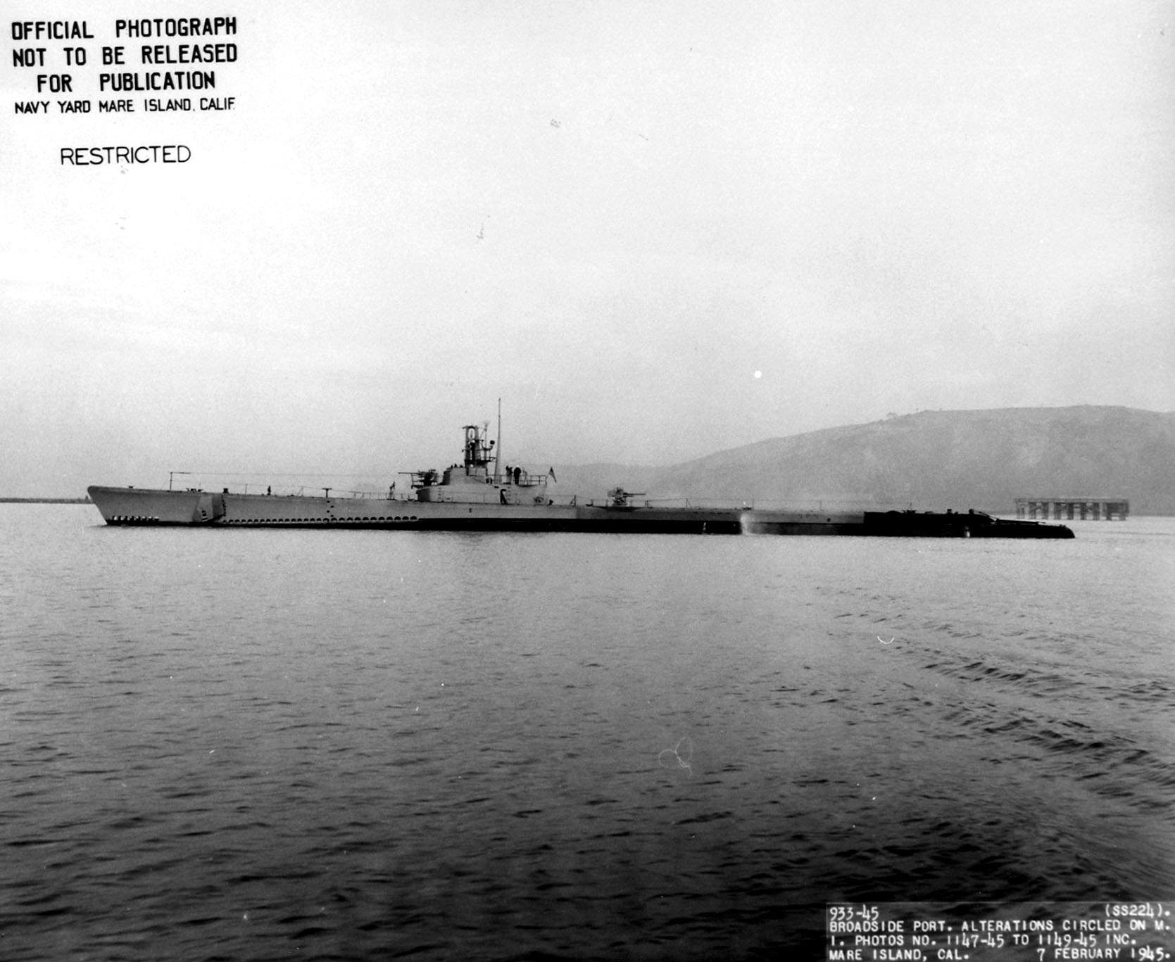 ![]() | 190k | Broadside view of Cod (SS-224) off Mare Island on 7 February 1945. She was in overhaul at the yard from 1 December 44 until 20 February 45. | USN photo # 933-45, courtesy of Darryl L. Baker. | |