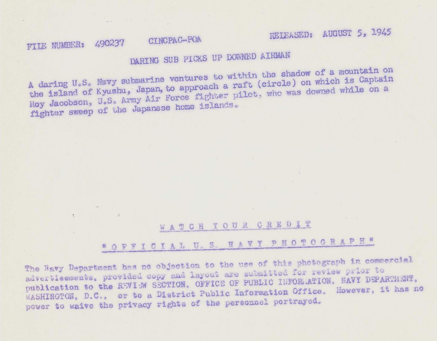 ![]() | 475k | Quillback (SS-424) picking up downed USAAF pilot Captain Roy Jacobson (circled), within sight of the coast of Kyushu, after a August 1945 air strike over Japan. | Photo i.d. courtesy of Raymond Smith. Official USN photos courtesy of Ed Zajkowski. |