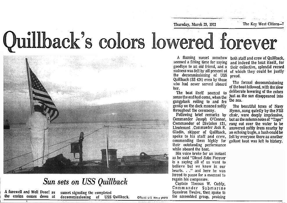 129k | Quillback (SS-424), decommissioning article, 29 March 1973 from the Key West Citizen. | Courtesy of Mike Keating. | |