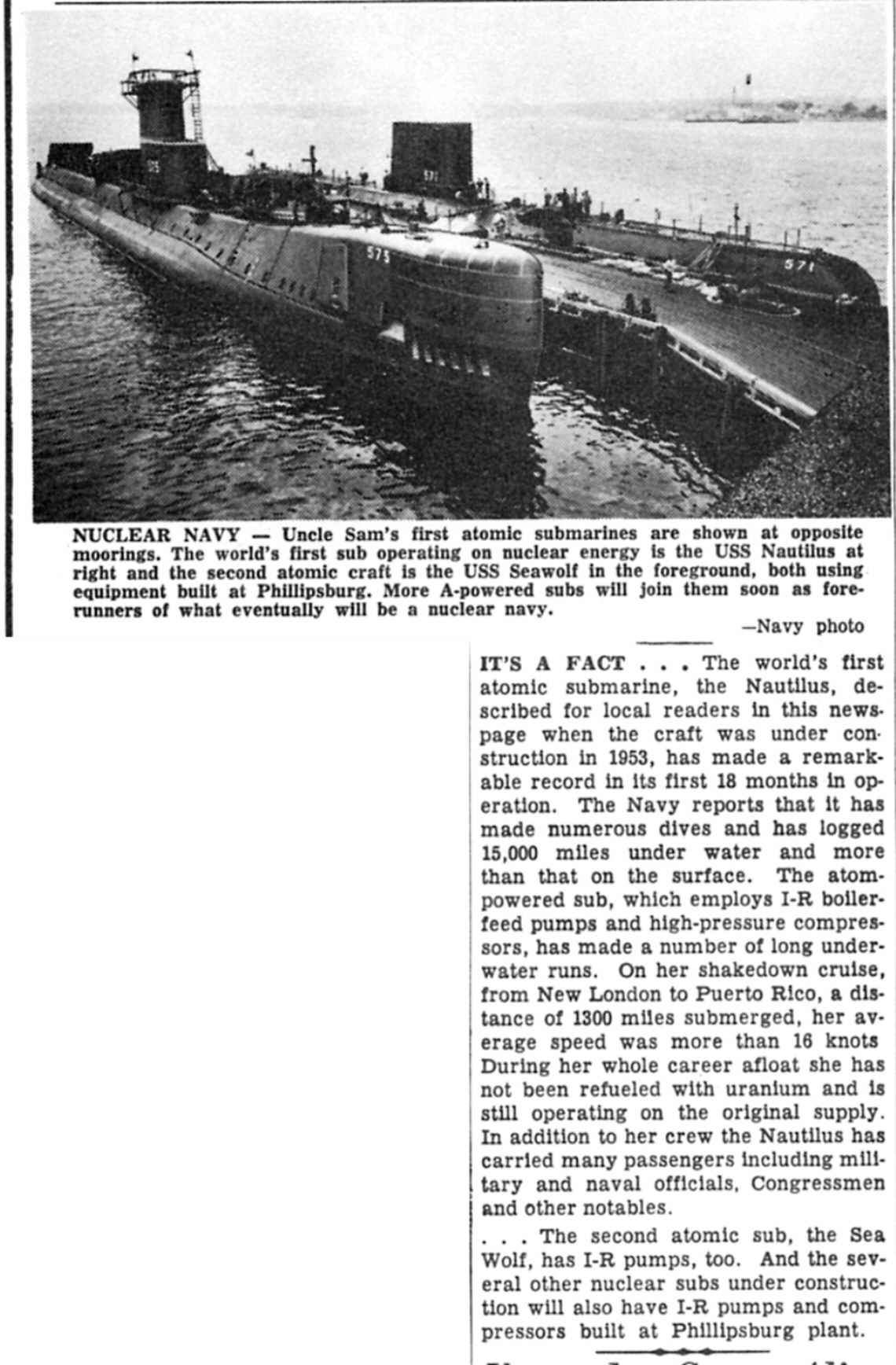 | 193k | Seawolf (SSN-575) undergoing some TLC alongside Nautilus (SSN-571) at Groton appear together in an Ingersol-Rand Company newsbrief dated 5 June 1956. | Insert courtesy of Ron Titus. USN photo courtesy of town.groton.ct. | |