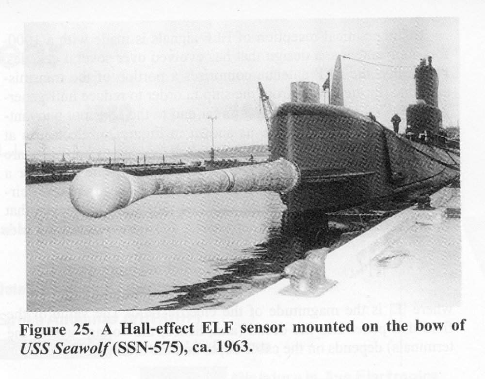 ![]() | 84k | Looking pretty much like a giant door stopper, this circa 1963 photo shows the Seawolf (SSN-575) with a Hall-effect ELF sensor mounted on her bow. | From the IEEE Antennas and Propagation Magazine, Vol. 46, No. 1, February 2004. Submitted by Anton Karklit. | |
