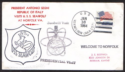 ![]() | 39k | Commemorative post mark on the occasion of the President of Italy, the Honorable Antonio Segni visit on the Seawolf (SSN-575) at Norfolk VA, 16 January 1964. | Courtesy of Jack Treutle (of blessed memory). | |