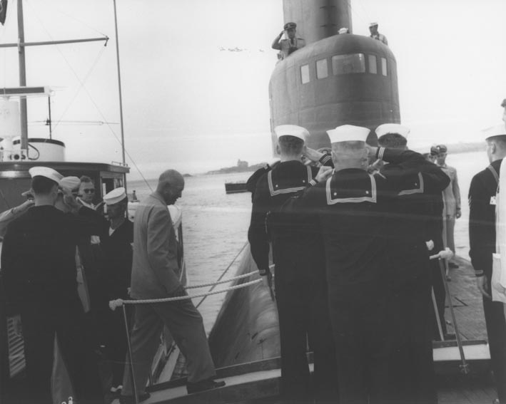 436k | President Dwight D. Eisenhower going aboard the atomic-powered submarine Seawolf (SSN-575) from the presidential yacht Barbara Anne off Newport, RI, 26 September 1957. | Photo courtesy of James L. Goodwin via his son, Kevin. Copy of Naval Historical Center Image # NH 68559 in former Navy files now in the collection of the National Archives, San Francisco Branch" & submitted by Tracy White @ Researcher @ Large. | |