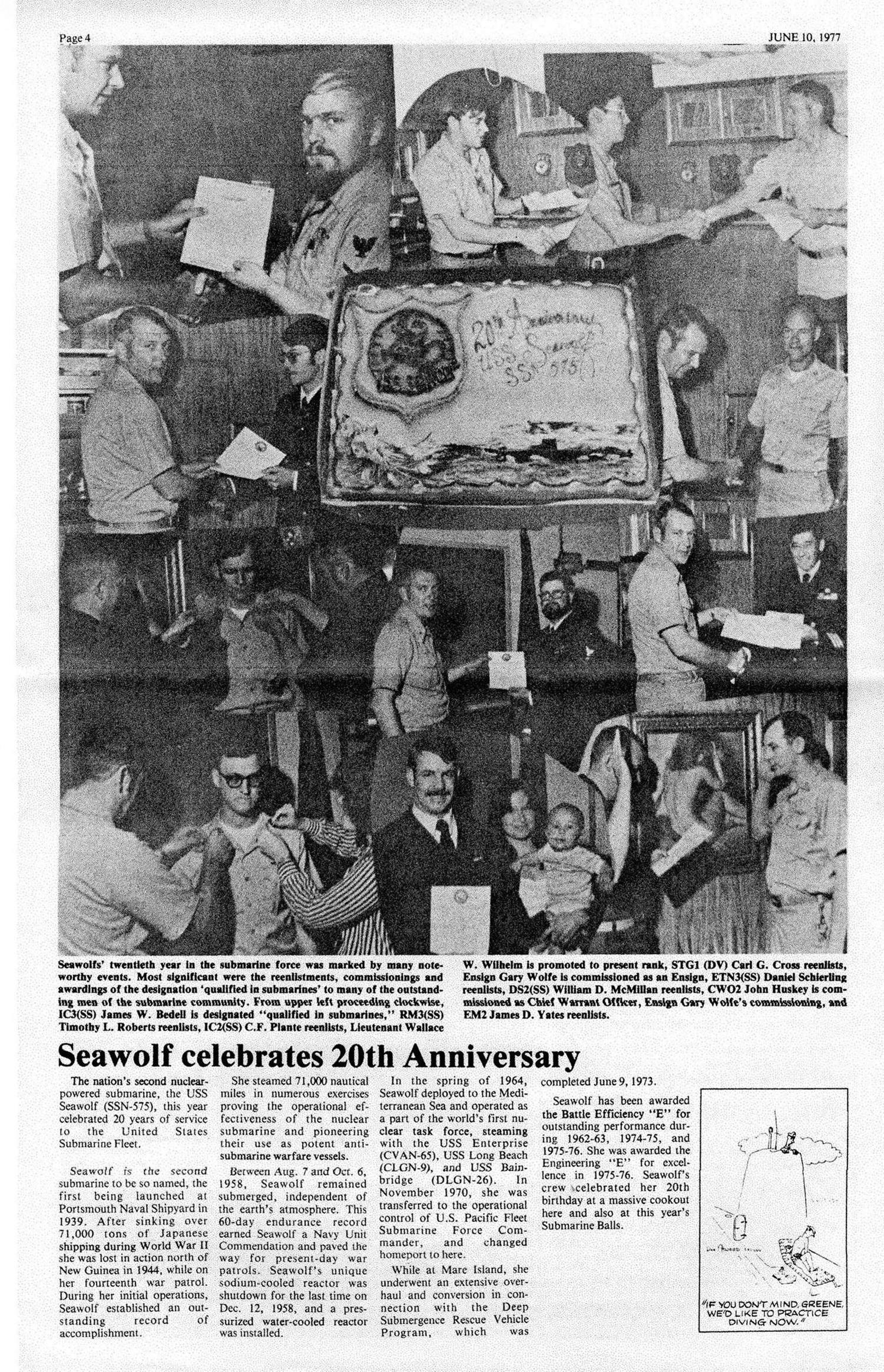 ![]() 0857520b | 2.74k | Article from Mare Island Naval Station newspaper Mares Tale, 10 June 1977 edition covering the 20th commissioning birthday of the Seawolf (SSN-575). | Photo MINSY 128732-3-75, via Darryl L. Baker. | |