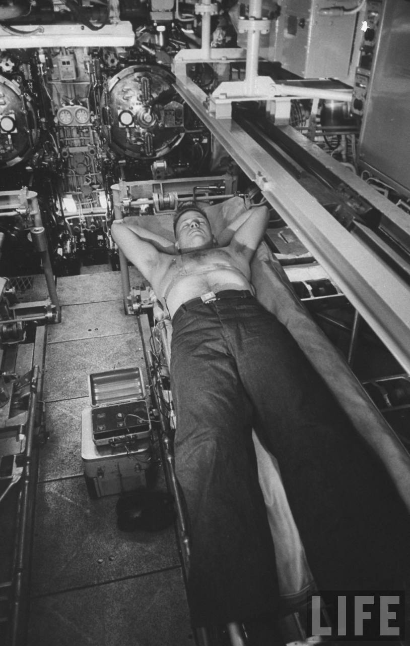 ![]() | 118k | Crew member aboard submarine Seawolf (SSN-575) getting massage with relaxacizor set to keep up physical fitness during voyage, October 1960. | Photographer: Yale Joel, courtesy of life.time.com | |