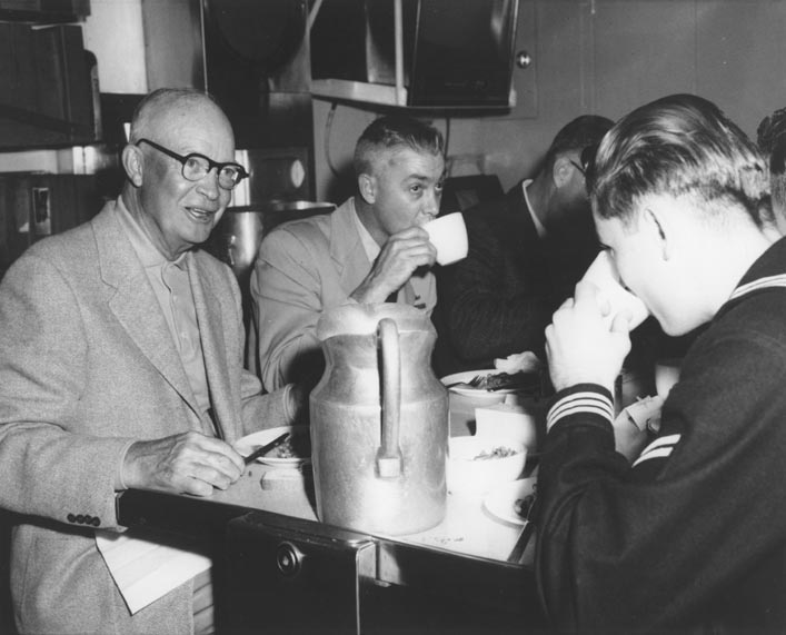 ![]() | 55k | President Dwight D. Eisenhower aboard the atomic-powered submarine Seawolf (SSN-575) off Newport, RI, 26 September 1957. Here the President eats with the crew. On the president's left is Milton W. Tucker, partly hidden, is James Hagerty, presidential press secretary. Across from the president is W.J. Dooling, SA, USN, (drinking coffee), who is the youngest man in the crew. | Copy of Naval Historical Center Image # NH 68560 in former Navy files now in the collection of the National Archives, San Francisco Branch" & submitted by Tracy White@ Researcher @ Large. | |