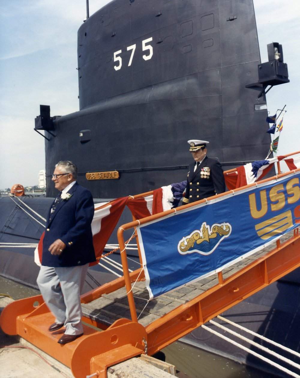 ![]() | 110k | Retired Capt. R. B. Laning [first commanding officer] of Seawolf (SSN-575) followed by CDR R. W. Talipsky [last commanding officer] of Seawolf depart at the conclusion of the boat's decommissioning. | USN photo # 219994-3-87, courtesy of Darry L. Baker. | |
