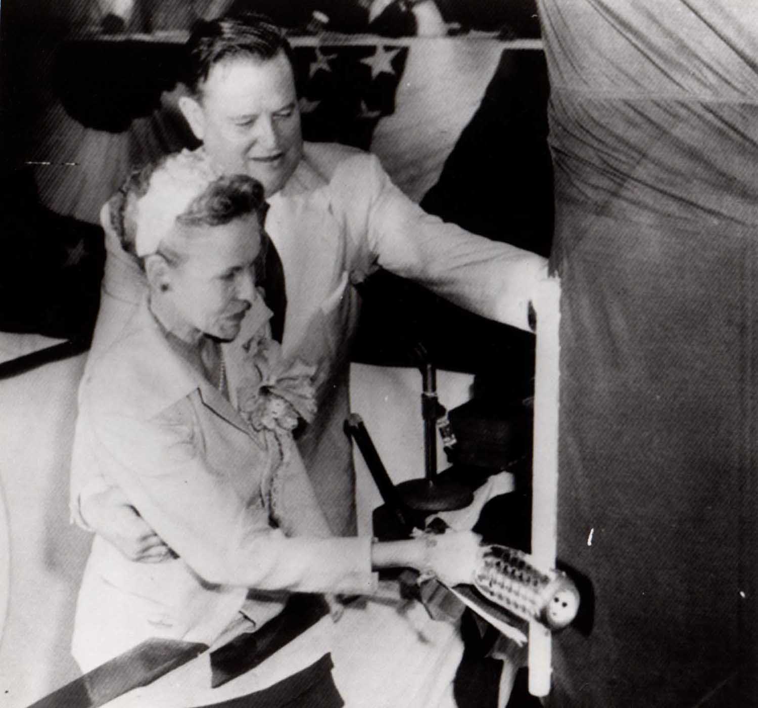 NR | WASHINGTONIANS 'CONTROL' SUB These two Washington business men (left to right), Kenneth D. Nichols, consulting engineer, and William C. Foster, executive vice president, Washington office, Olin Mathieson Chemical Corp., are seen aboard the atomic submarine Seawolf (SSN-575) during a cruise off New London, Conn. They were among members of the United States Chamber of Commerce’s Committee on Commercial Uses of Atomic Energy invited by the Navy aboard the craft. | General Dynamics Corp. Photo Image and text provided by Library of Congress, Washington, DC. Photo & text by Evening Star. [volume] (Washington, D.C.) 1854-1972, 02 July 1957, Image 18, via chroniclingamerica.loc.gov. | |