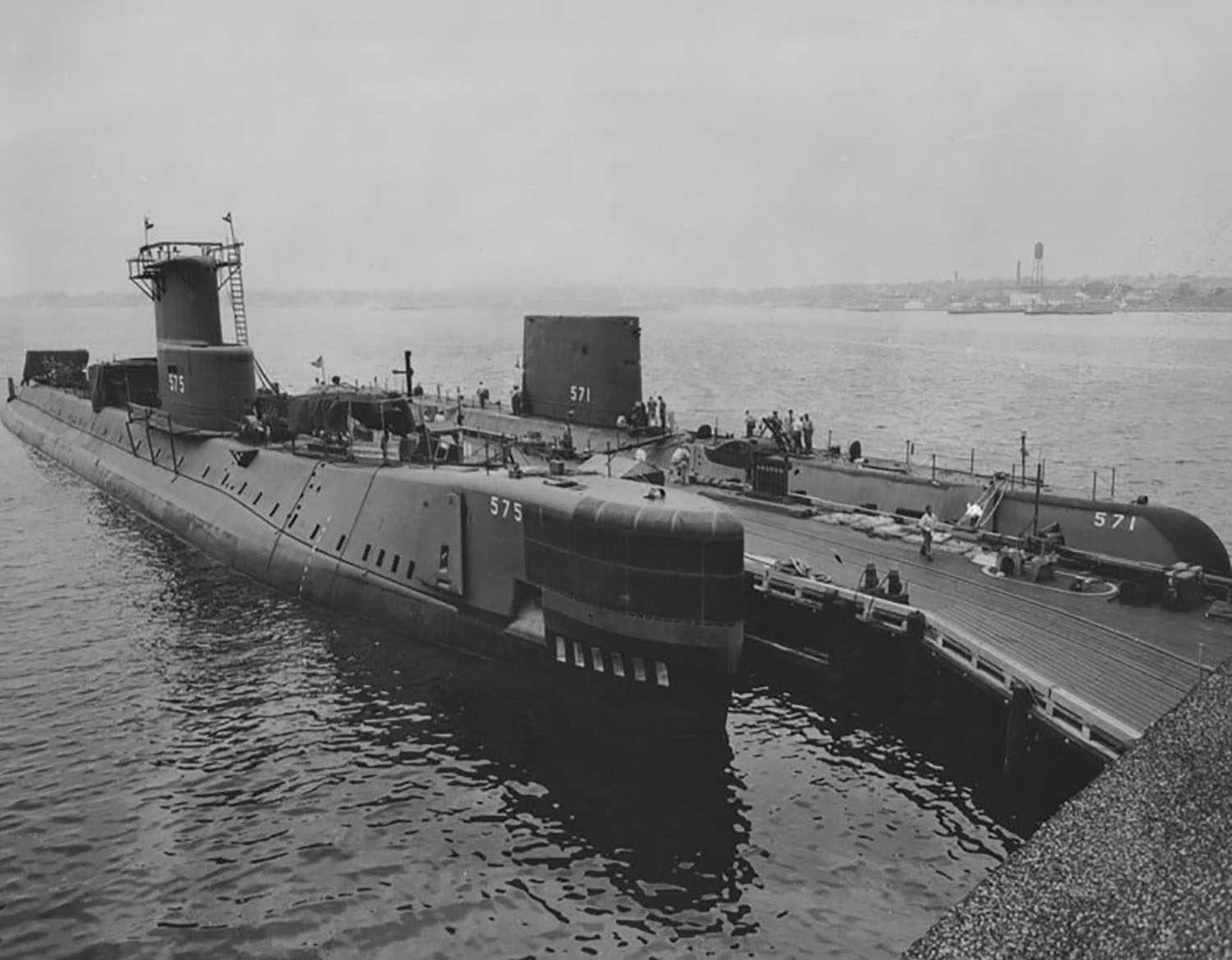 | 496k | The Fission Fleet. The first three ships in the Nuclear Navy: Nautilus (SSN-571), Seawolf (SSN-575), and Skate (SSN-578), are shown together for the first time at General Dynamic Corporation's Electric Boat Division in Groton, Connecticut, where they were built. The Seawolf and Nautilus returned to their birthplace for a brief upkeep period while Skate, launched 16 May is being readied for builder's trials. Sixteen additional atomic submarines have been ordered by the Navy. Nautilus departed 19 August to participate in NATO Exercises. |