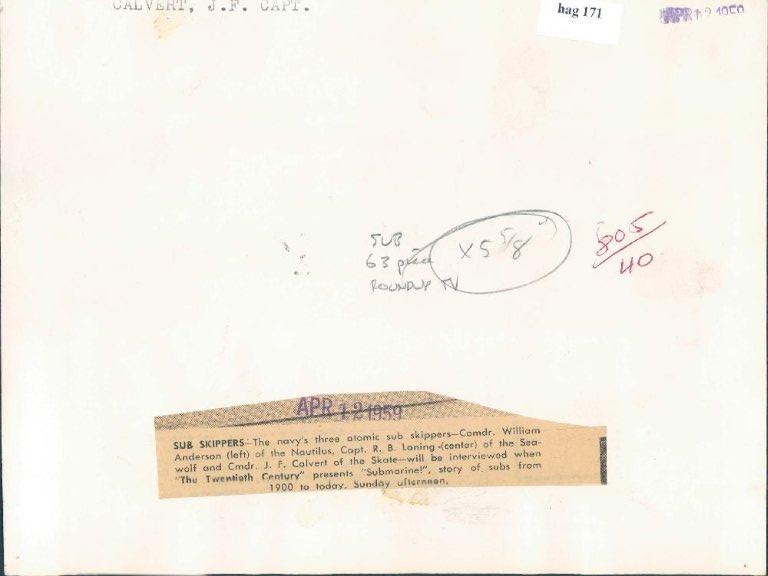 1.34k | Atomic Submarines Honored at New London, CT., 26 October 1958 by AP (see their caption). Left to right: CDR Robert B. Laning Seawolf (SSN-575), CDR William R. Anderson Nautilus (SSN-571), and CDR James F. Calvert Skate (SSN-578). | USN photo courtesy of the Vallejo Naval & Historical Museum via Darryl L. Baker. | |
