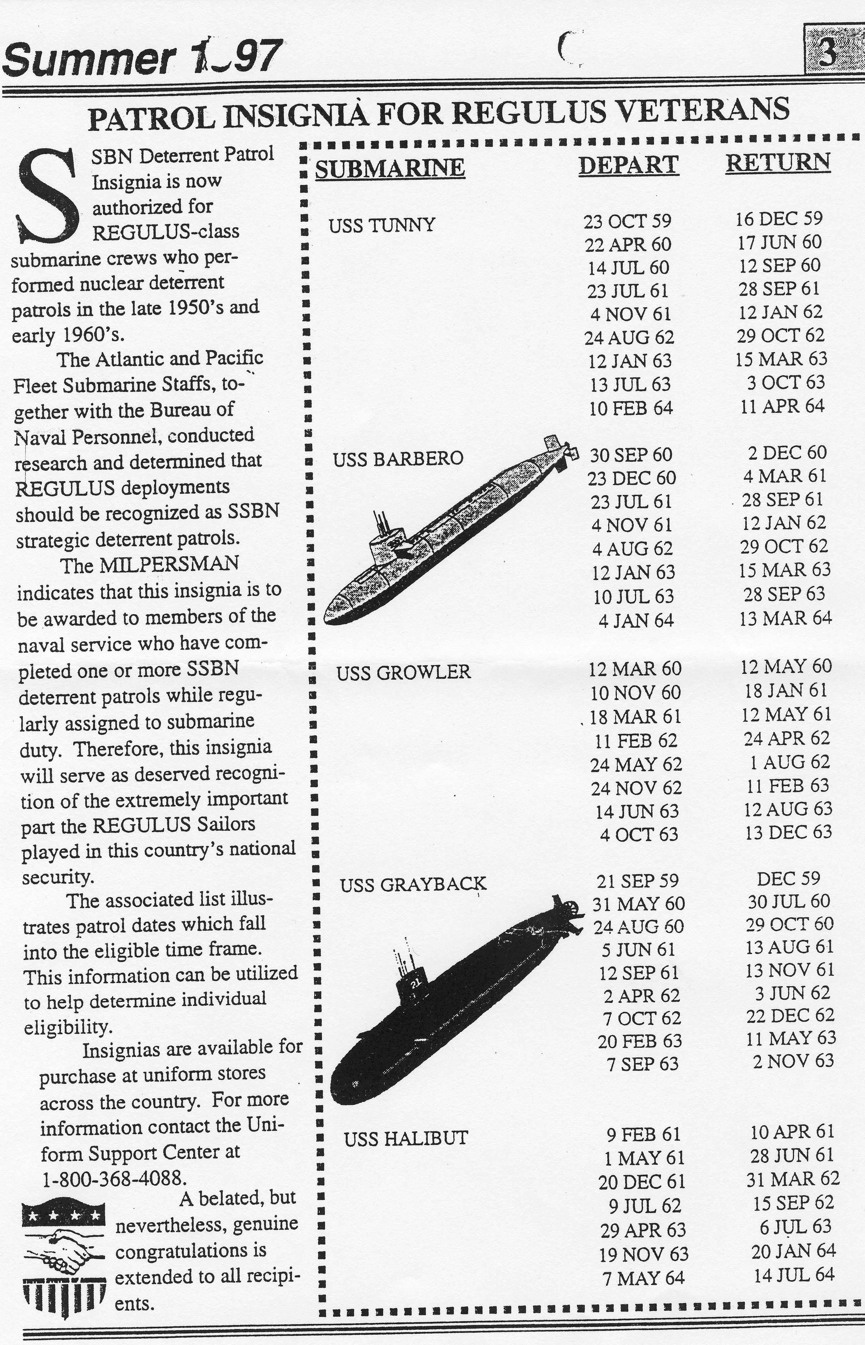 ![]() | 1.30k | Regulus Deterrent Patrols by the following submarines from September 1959 to July 1964: Tunny (SSG-282), Barbero (SSG-317), Grayback (SSG-574), Growler (SSG-577),& Halibut (SSGN-587). |