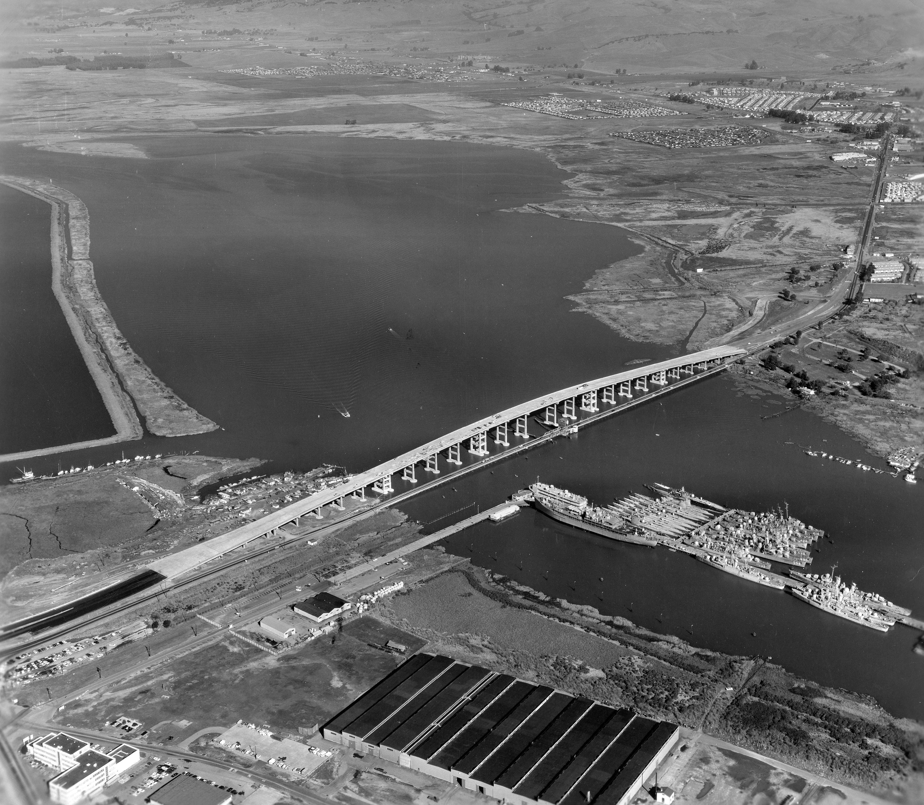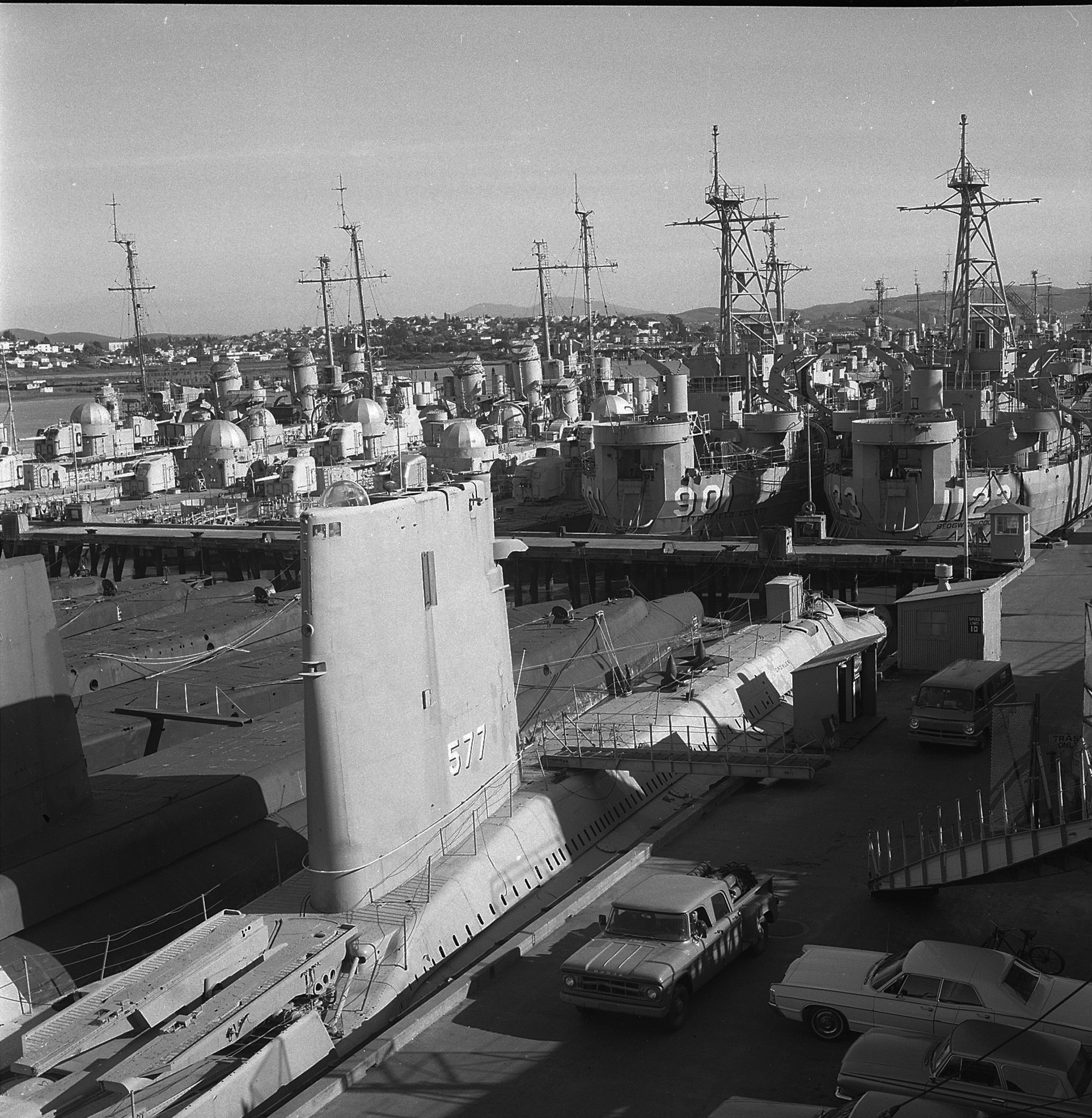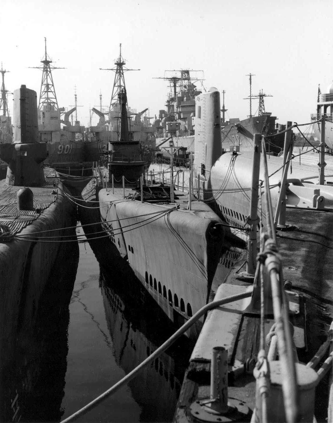 ![]() | 4.12k | Aerial photo of the Mare Island Reserve Fleet taken 25 November 1966 shown Growler (SSG-577), six old fleet boats, Bass (SSK-2), Bonita (SSK-3), Grayback (SSG-574) and another fleet boat. The Pelias (AS-14) is the sub tender located with the submarines. | Photograph courtesy of Darryl L. Baker. | |
