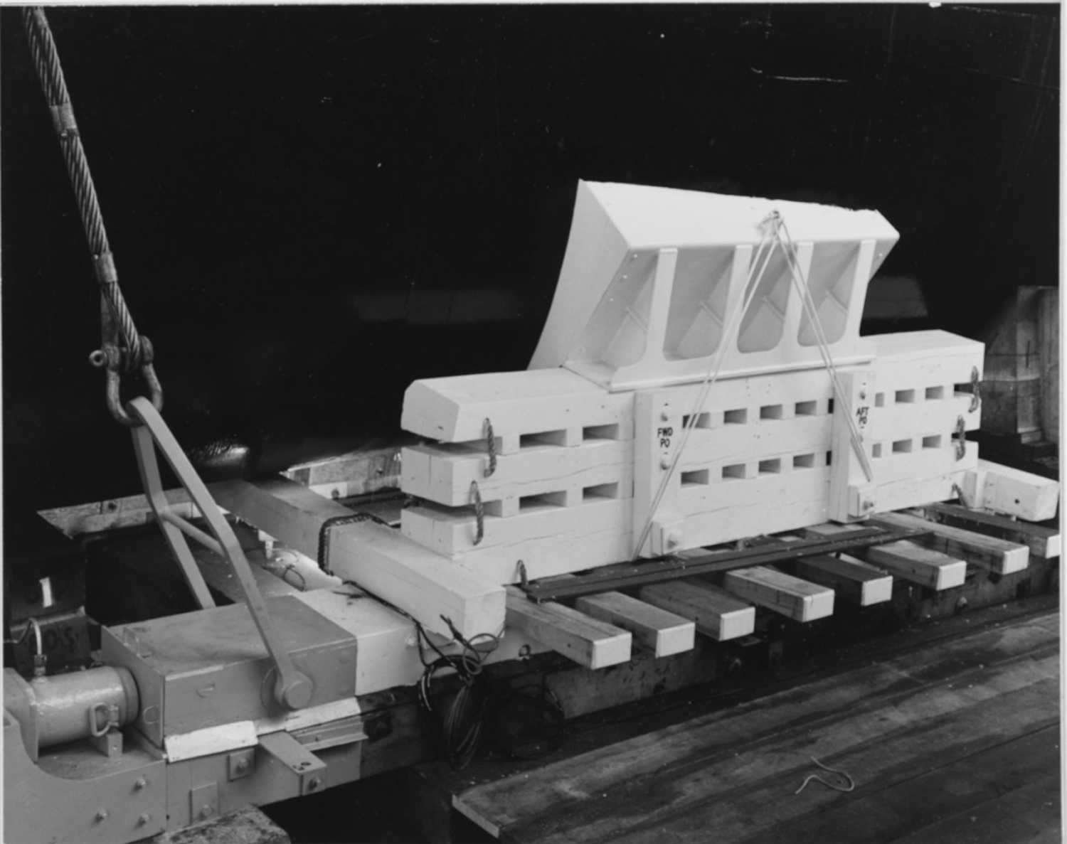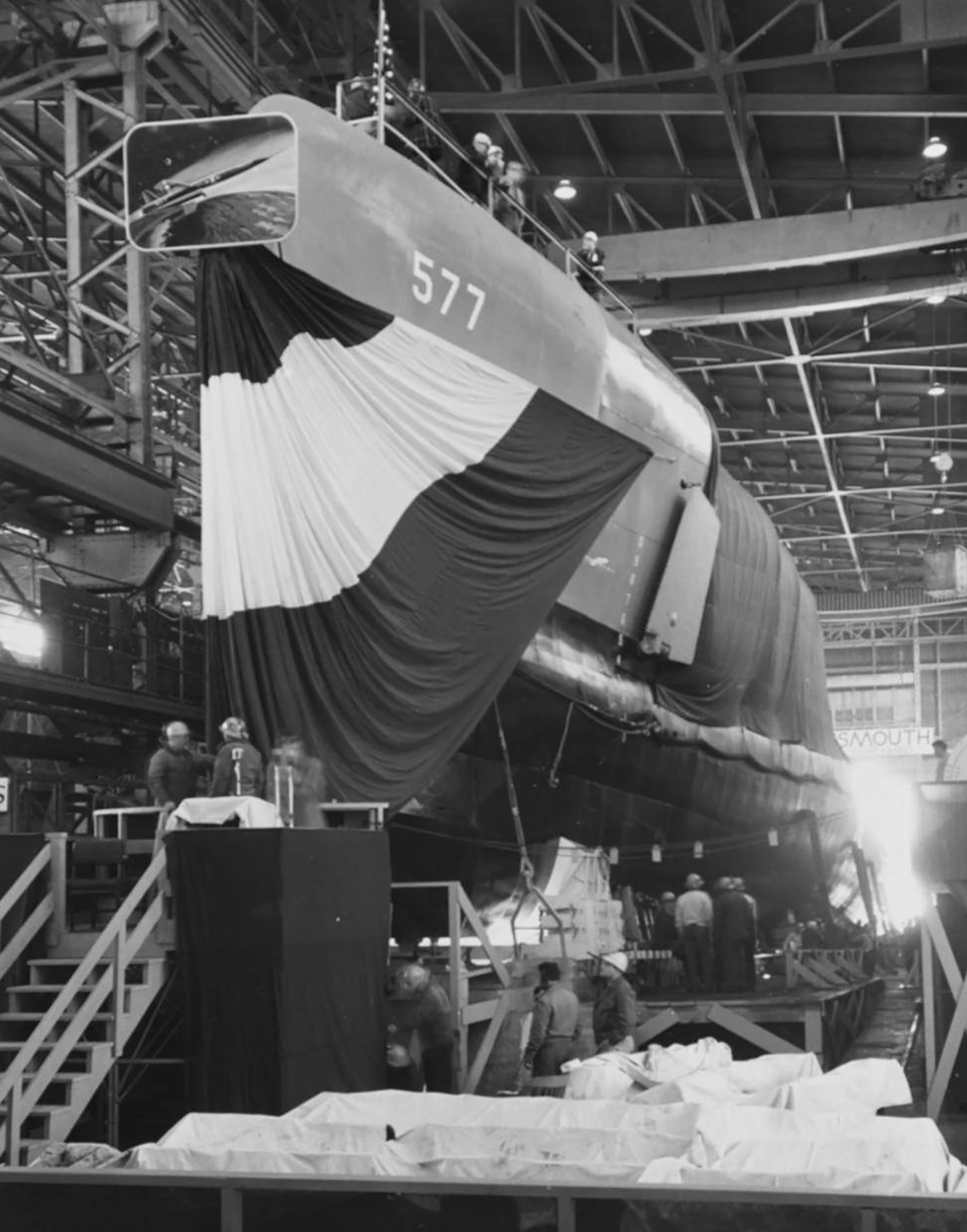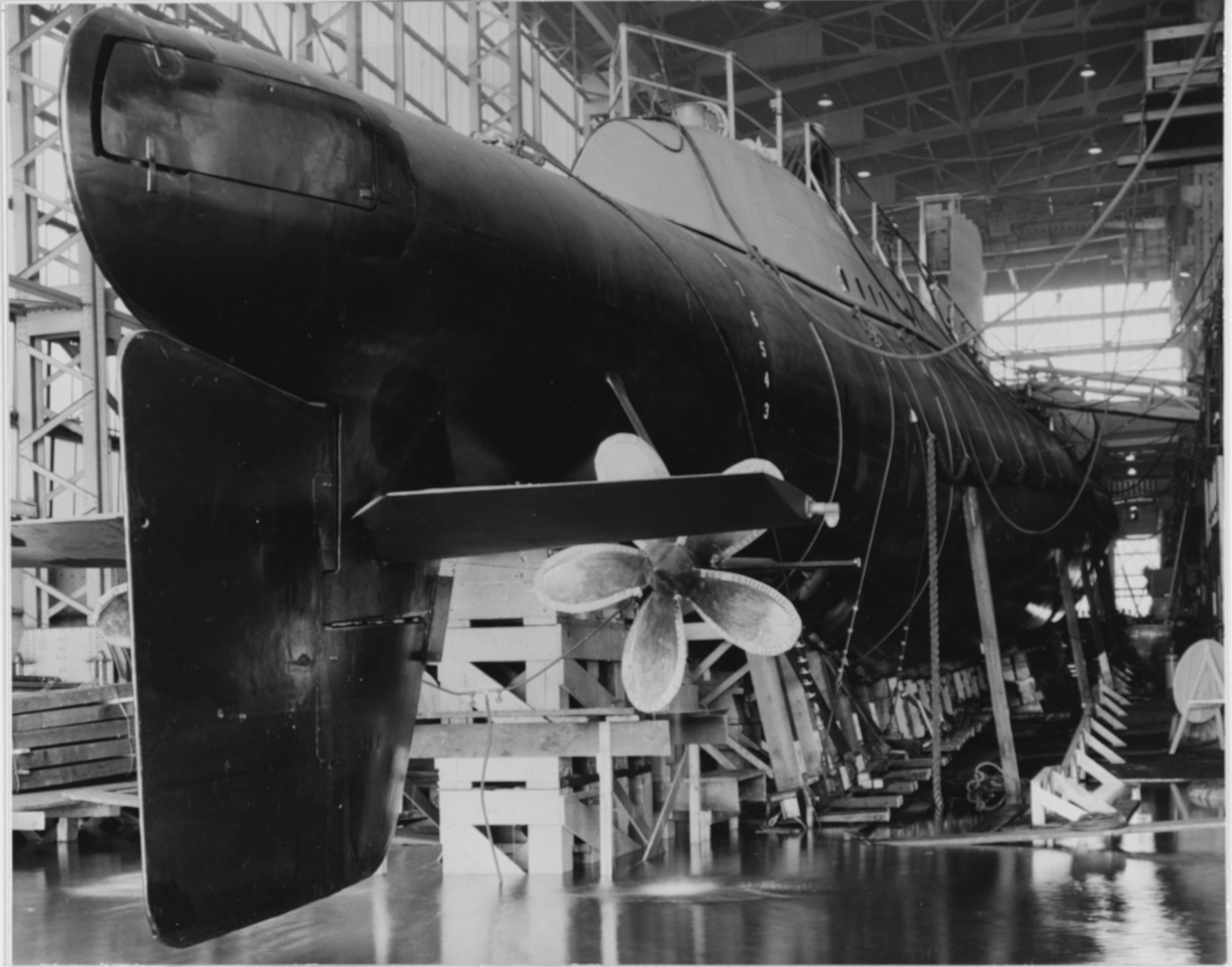 ![]() 0857711 | 727k | Being readied for launching, at the Portsmouth Navy Yard, New Hampshire, 5 April 1958. View of port side of bow poppet of Growler (SSG-577). | Photo NH-53791 courtesy history.navy.mil | |