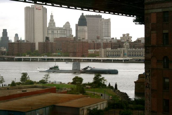 ![]() | 80k | The Growler (SSG-577) being tugged up the East River 25 September 2009, on its way to GMD Shipyard Corp. facilities at the Brooklyn Navy Yard. The Growler is in dry dock for a hull scrape, some minor exterior repairs and a full, historically accurate paint job that will see the sides painted grey and the top painted black. | Photo courtesy of Jen Carlson & gothamist.com via thesubreport.com. | |