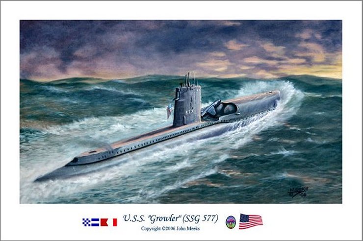 ![]() | 177k | Growler (SSG-577) with a Regulus missile and launcher appearing in front of the sail, circa 1959-60. | Courtesy of Nick Spark. | |