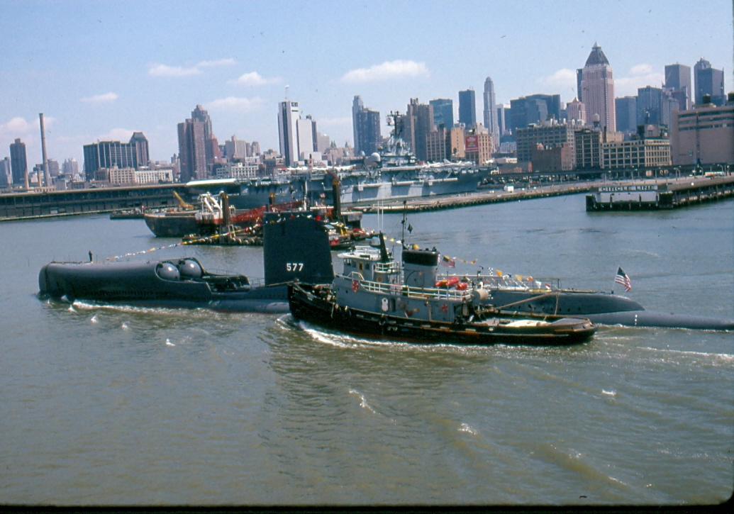 ![]() | 248k | The Tugboat Hackensack (YTM-750) pushing the Ex-Growler (SSG-577) up to the Intrepid Museum in 1988. Fresh from the refit at Tampa Ship. | Photo courtesy US Navy, ussnewyork.com & subpride via Scott Koen. | |