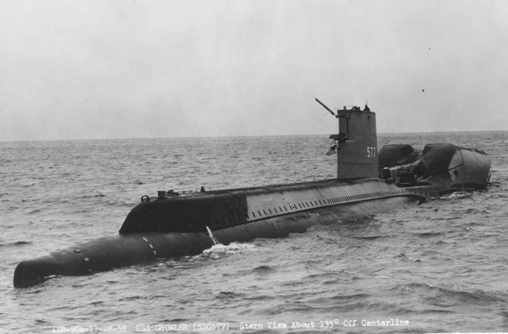 ![]() | 172k | Stern view of the Growler (SSG-577) on 28 November 1958. | USN photo # USN 1039790, courtesy of Scott Koen & ussnewyork.com. | |