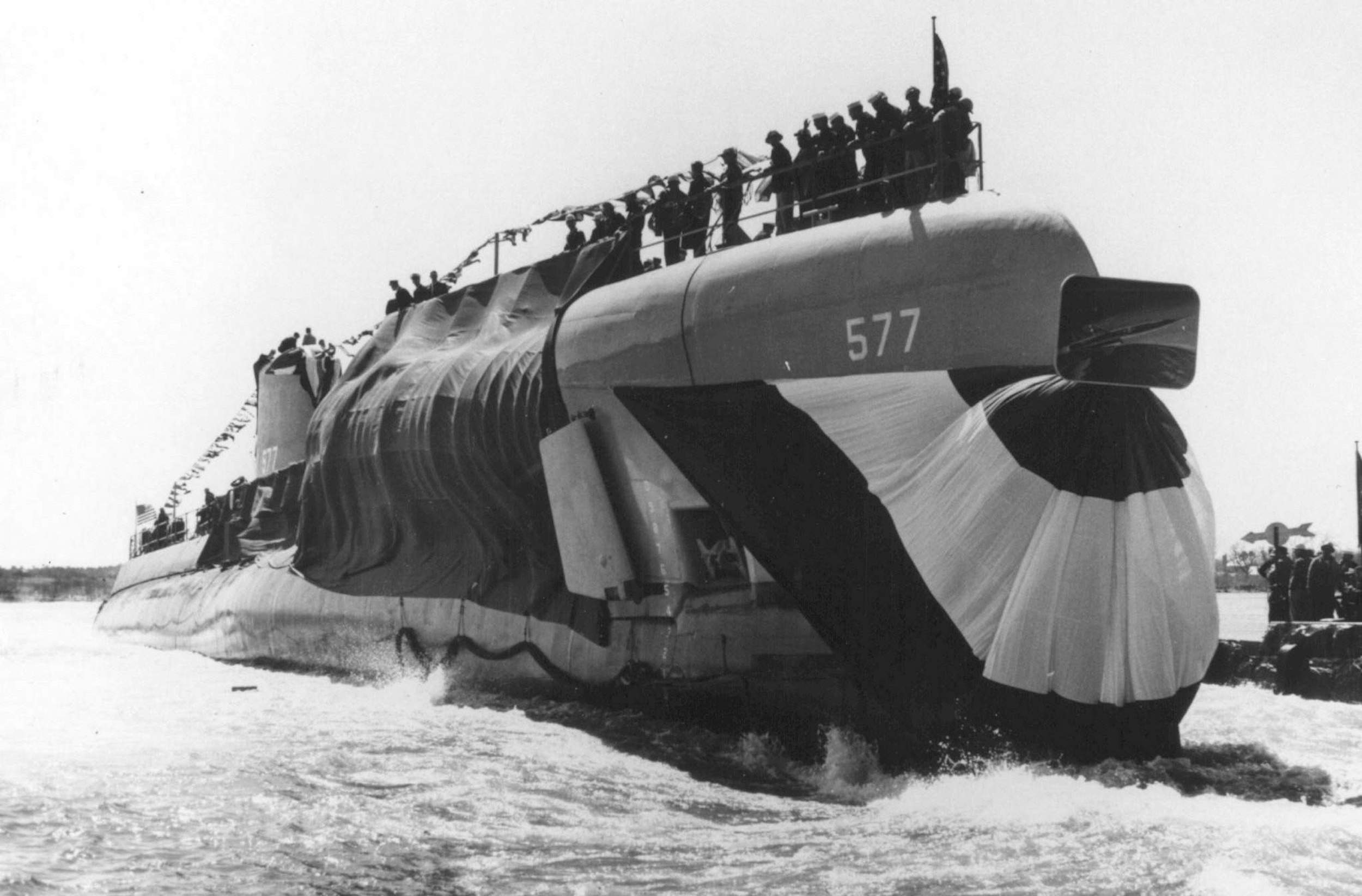 ![]() | 1.20k | The Growler (SSG-577) slides down the launching ways on 5 April 1958 at Portsmouth Naval Shipyard, Kittery, ME. | USN photo # USN 1039790, courtesy of Scott Koen & ussnewyork.com. | |