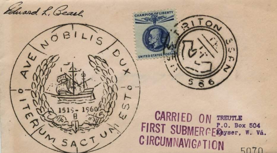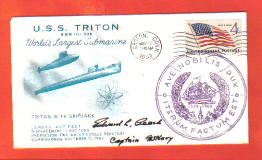60k | Commemorative postal cover issued on the occasion on the Triton (SSRN-586) having completed the first submerged circumnavigation of the earth, 10 April 1960, 60 days and 21 hours. Capt. Edward L. "Ned" Beach, Jr., signature appears at top. | Photo courtesy of Jack Treutle (of blessed memory). | |