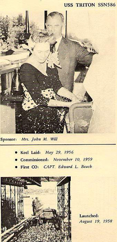 ![]() | 340k | The Triton (SSRN-586) was sponsored by Mrs. John Will on 19 August 1958. | Text courtesy of DANFS. Photo courtesy of Scott Koen & ussnewyork.com. |