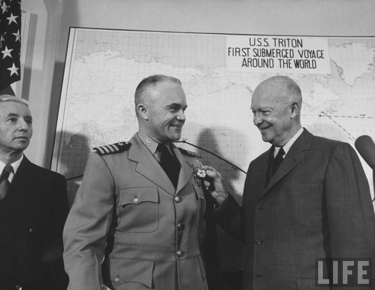 117k | USN Capt. Edward L. Beach (center) receiving decoration from Pres. Dwight D. Eisenhower (R) after historic underwater voyage around the world as Adm. Hyman G. Rickover looks on in New London, CT., May 1960. | Photographer: Yale Joel, courtesy of life.time.com | |