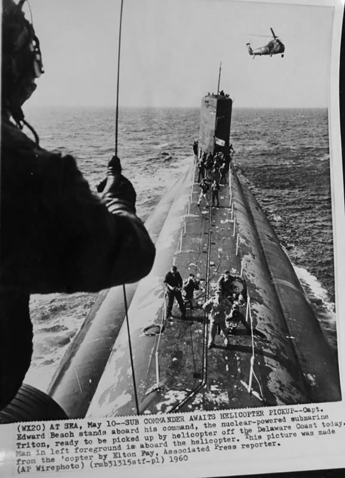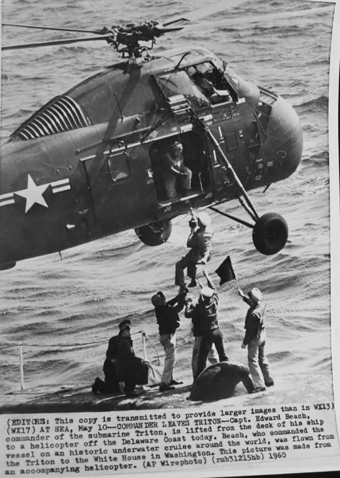 406k | Helicopter picking up Captain Beach for transfer to the White House. | Photo courtesy of the Triton's (SSRN-586) photographer, William Hadley via Garry Gray. Insert photo courtesy of Tommy Trampp. |