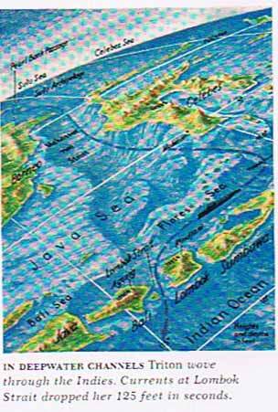 35k | In deep-water channels Triton (SSRN-586) wove through the Indies. Currents at Lombok Strait dropped her 125 feet in seconds. | Photo from the book Great Adventures with National Geographic, 1963. Page 143. | |